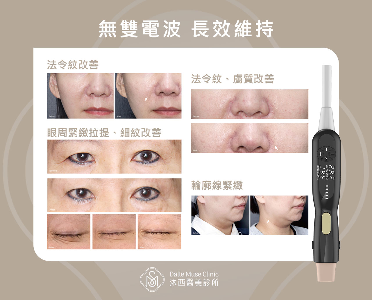 - 撫平皺紋:有效淡化法令紋、木偶紋、眼周細紋、抬頭紋等 。