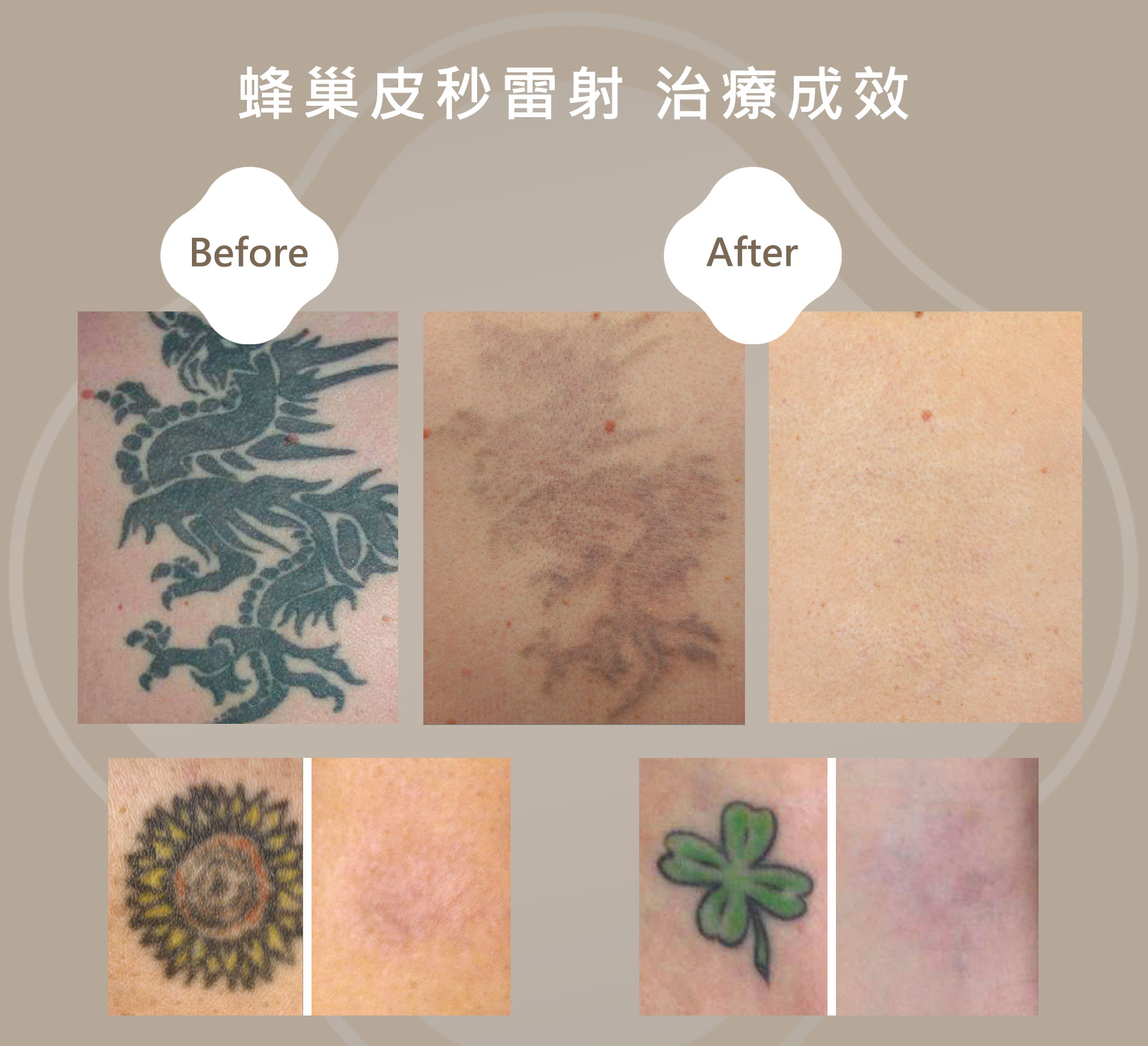 - 皮秒雷射:效果較快,約4次可見到色素逐漸變淡,依照個人體質與環境因素約4~6次療程,且每次間隔需約 4 週。