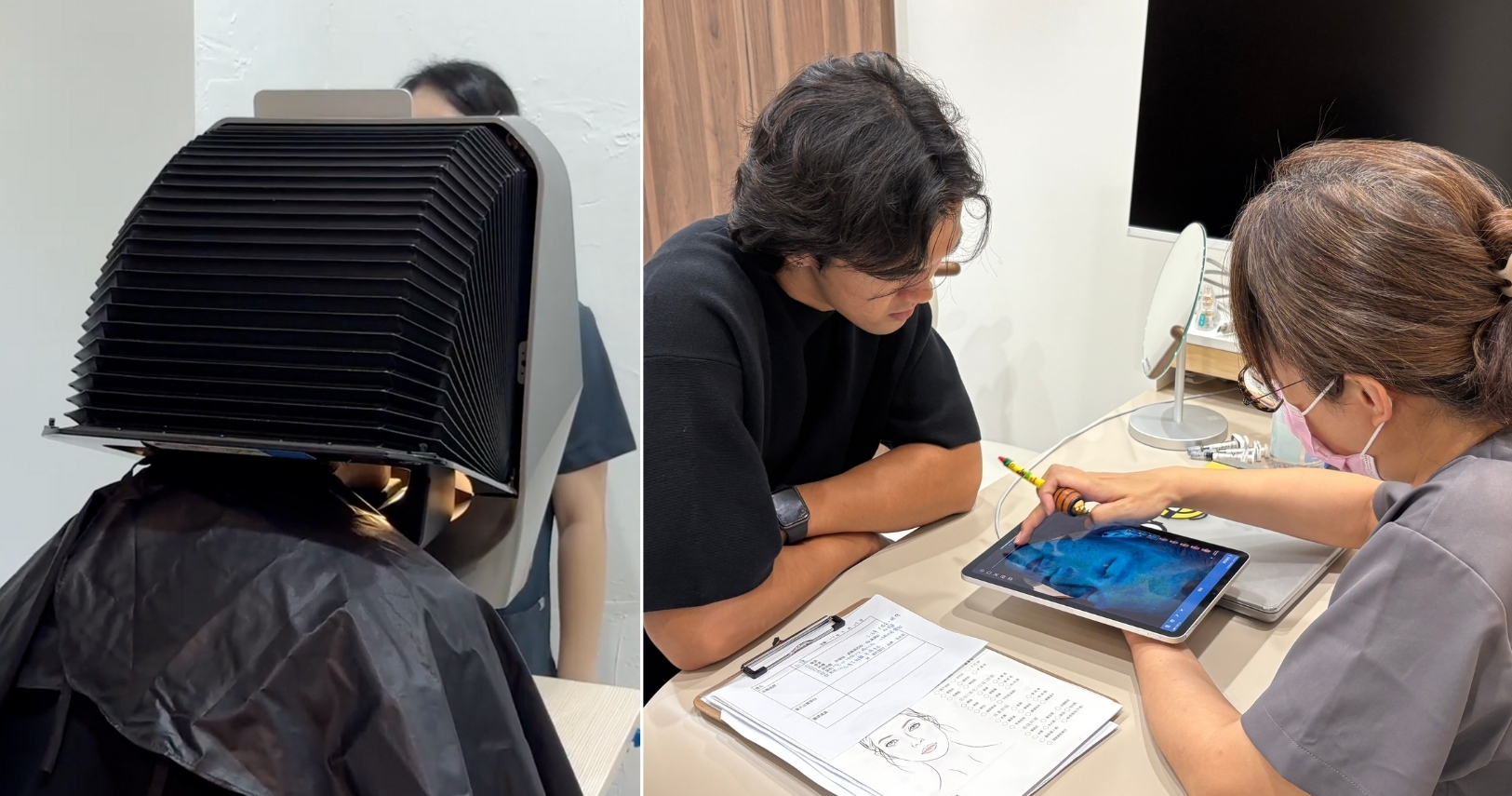 沐西的環境氛圍讓人非常放鬆,完全沒有壓力。服務人員溫柔又親切,每個步驟都很專業。洗卸後還會進行肌膚檢測,用數據分析肌膚表面和潛在問題,讓醫師能更精準地規劃療程,也讓我對效果更有信心。最後,我決定嘗試「無限電波+麗珠蘭」的搭配療程。