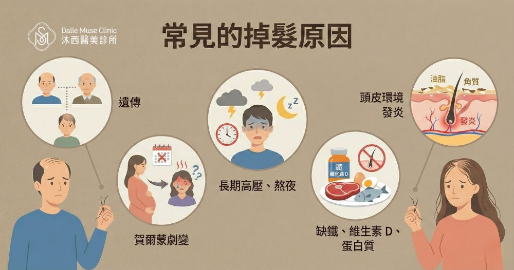 除了常見的遺傳因素,落髮往往是身體內部失衡的訊號。常見的 掉髮原因 包括: